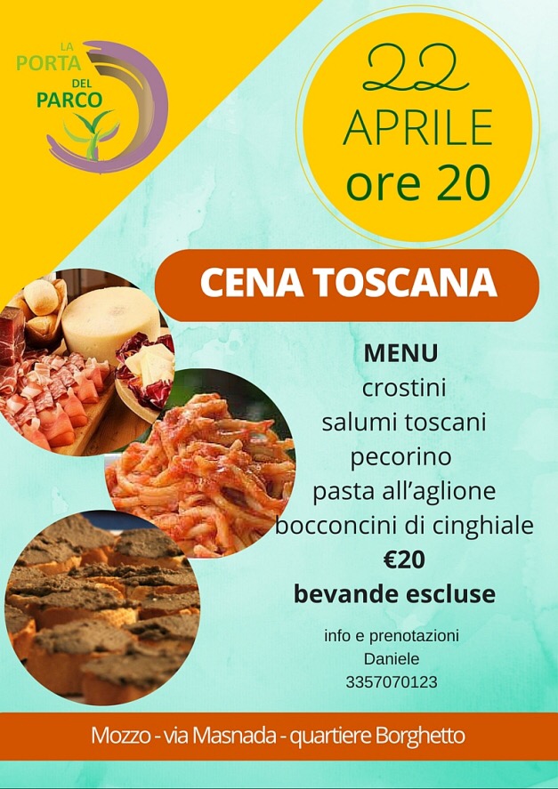 Mozzo/Borghetto: Cena TOSCANA il 22 aprile admin20 aprile 201618 aprile 2016blog post Navigazione articoli PrecedenteContinua Condividi:CondivisioneTweet Fai clic qui per stampare (Si apre in una nuova finestra) Stampa Fai clic per inviare un link a un amico via e-mail (Si apre in una nuova finestra) E-mail Mi piace Caricamento... Correlati