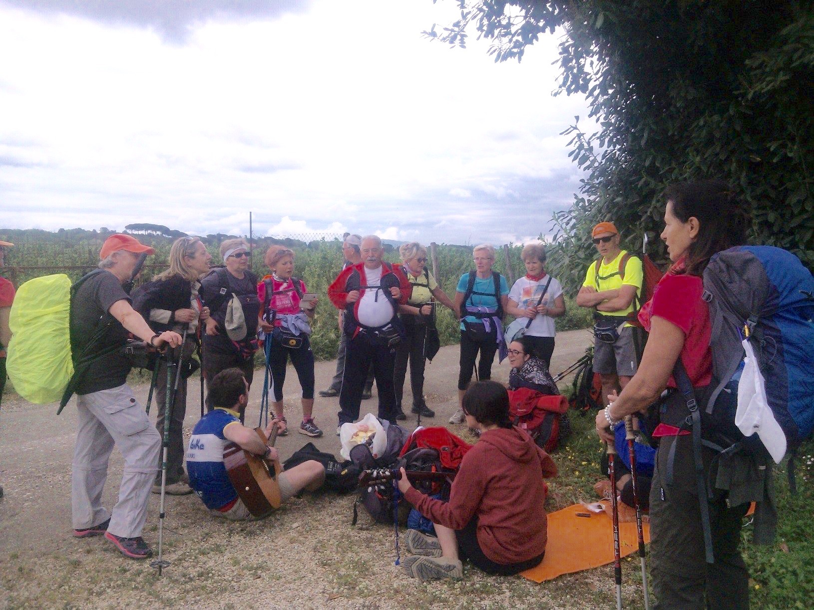 “24 aprile : lasciamo Suor Renata e le sue francescane, dove siamo stati accolti e coccolati x due giorni per percorrere il terzo tratto di francigena: da Sutri a Monterosi. Entriamo nell ager romano e olivi e campi di grano e orzo prendono il posto dei noccioleti e castagneti. Verdi panorami collinari, cavalli, pecore e asinelli ci accompagnano verso il lago di Monterosi. Siamo in compagnia, sul cammino: un gruppo di ragazzi che oggi cammina sul nostro stesso tragitto si ferma a suonare e cantare…e il coro e’ presto fatto! Venditti, Battisti, Bennato…mezz’ora di condivisione tra generazioni diverse unite dal Cammino. Un po’ di stretching e di nuovo sul percorso…e nemmeno una goccia di pioggia!”