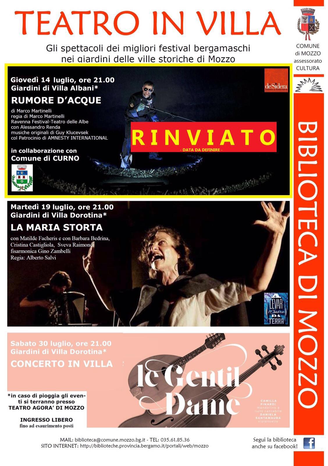 Precisazione: Lo spettacolo “Rumori d’acque” di ieri è stato rinviato pochi istanti primi dell’inizio a causa delle condizioni meteo peggiorare repentinamente pico prima dello spettacolo. Purtroppo non è stato possibile riallestire l’impianto luci e quello fonico presso l’Agorà in tempi brevi e quindi non si è potuta utilizzare la sede alternativa.