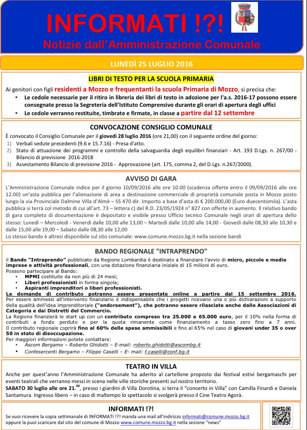 Mozzo/Comune: INFORMATI DEL 25 luglio admin27 luglio 2016blog post Navigazione articoli PrecedenteContinua Condividi:CondivisioneTweet Fai clic qui per stampare (Si apre in una nuova finestra) Stampa Fai clic per inviare un link a un amico via e-mail (Si apre in una nuova finestra) E-mail Mi piace Caricamento... Correlati
