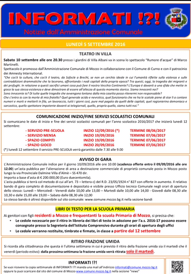 Mozzo/Comune: INFORMATI del 5 settembre admin6 settembre 2016blog post Navigazione articoli PrecedenteContinua Condividi:CondivisioneTweet Fai clic qui per stampare (Si apre in una nuova finestra) Stampa Fai clic per inviare un link a un amico via e-mail (Si apre in una nuova finestra) E-mail Mi piace Caricamento... Correlati