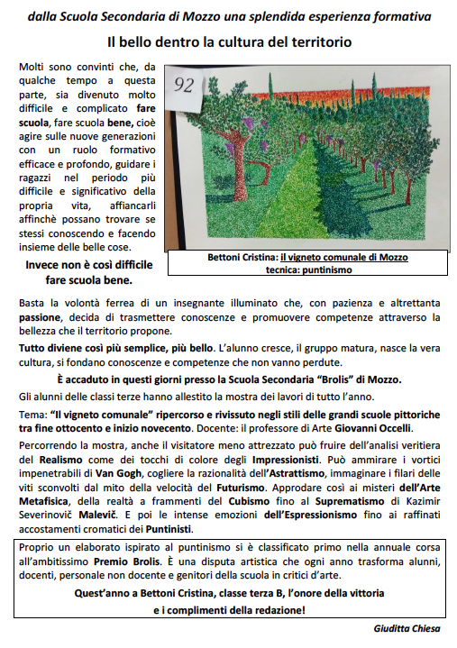 sabato 24 settembre alle ore 10.00 viene aperta la mostra di pittura “Il vigneto comunale… in arte” nella quale sono esposte le opere realizzate dai ragazzi delle classi terze della media Piero Brolis di Mozzo. Le opere hanno come tema il vigneto e la loro realizzazione è il frutto del progetto di arte sviluppato con uscite presso il vigneto stesso. Tutte le opere sono state realizzate con diverse tecniche pittoriche insegnate ai ragazzi dal professore di storia dell’arte, sig. Occelli, nel corso dell’anno scolastico 2016-2017. Le opere hanno preso parte al concorso “Piero Brolis” che ogni anno viene indetto all’interno della la scuola media e sostenuto dall’Amministrazione nel Piano per il Diritto allo studio. Si invitano tutti i cittadini all’inaugurazione della mostra per ammirare le pregevoli opere realizzate dai nostri ragazzi che resteranno in esposizione presso la Porta del Parco fino a domenica 2 ottobre.