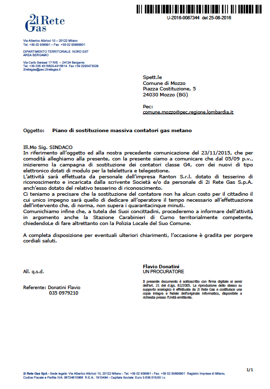 di Mozzo è la società 2i Rete Gas S.p.A. con sede legale in Via Alberico Albricci, 10 – 20122 Milano. Nei prossimi giorni tutti i clienti finali del Comune di Mozzo (BG) riceveranno una lettera informativa sulla recente direttiva dell’Autorità per l’Energia Elettrica e il Gas ed il sistema idrico in materia di sistemi di telelettura e telegestione. (deliberazione 631/2013/R/GAS) In quest’ottica si da l’opportuna informazione sulla programmazione dell’adeguamento del gruppo di misura mediante l’installazione di misuratori muniti di modulo per la telelettura e telegestione. Gli adeguamenti impiantistici richiesti, potrebbero comportare piccole modifiche all’impianto che saranno eseguite senza costi a carico dei clienti finali. E’ opportuno che tutti i cittadini siano a conoscenza dell’azione di lavoro programmata sul territorio da 2i Rete Gas S.p.A. e comunque per eventuali dubbi possono chiedere informazioni o verifiche al numero verde 800.997.710