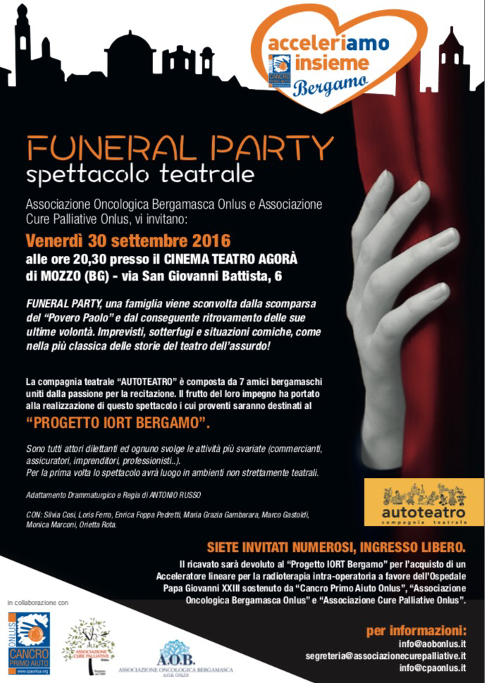 Venerdì 30 settembre, presso il cinema teatro AGORA’ di Mozzo, siete invitati allo spettacolo teatrale “FUNERAL PARTY” promosso dalla nostra Associazione in collaborazione con l’Associazione Cure Palliative Onlus. Il ricavato sarà devoluto al “Progetto IORT Bergamo”. L’ingresso è libero, vi aspettiamo numerosi. Vedi locandina