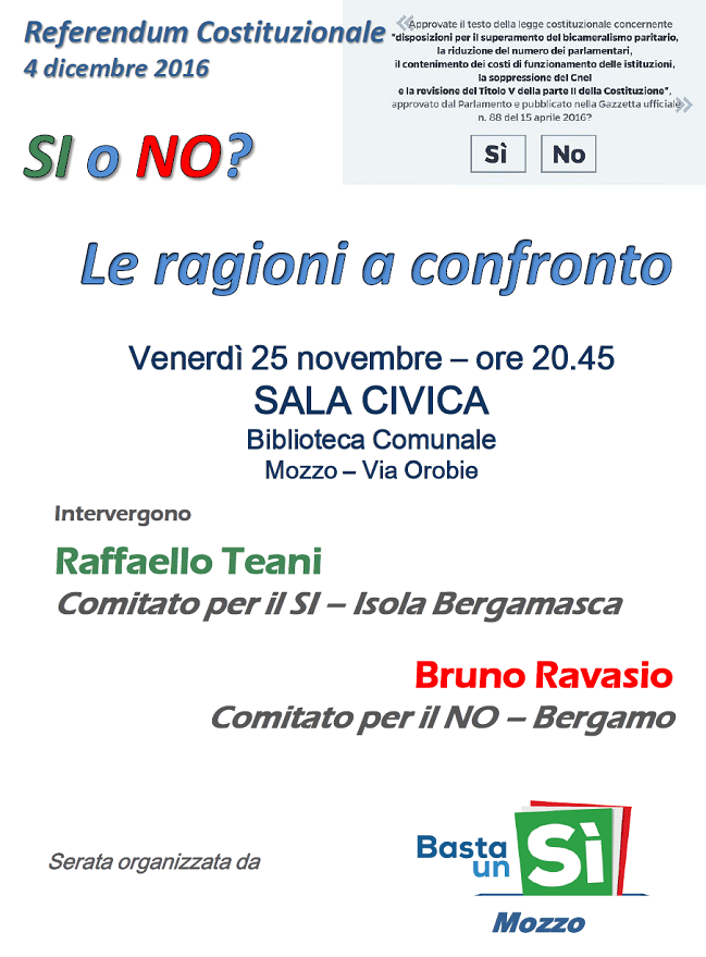 Mozzo/Referendum: confronto tra il SI e il No il 25 novembre admin22 novembre 2016blog post Navigazione articoli PrecedenteContinua Condividi:CondivisioneTweet Fai clic qui per stampare (Si apre in una nuova finestra) Stampa Fai clic per inviare un link a un amico via e-mail (Si apre in una nuova finestra) E-mail Mi piace Caricamento... Correlati