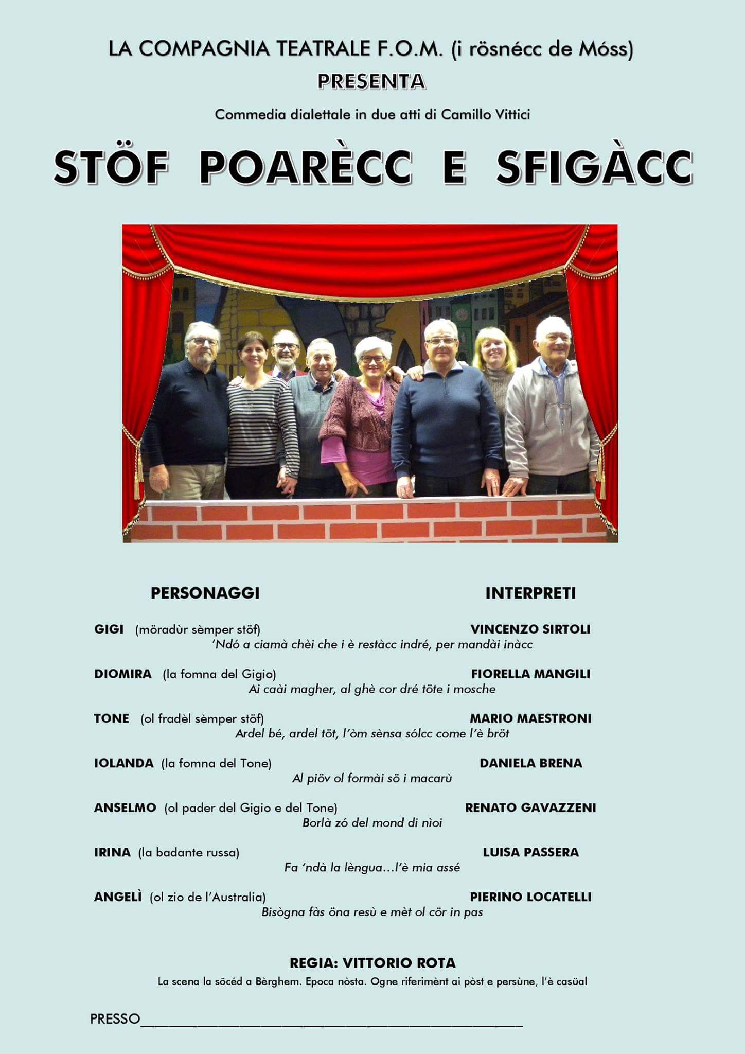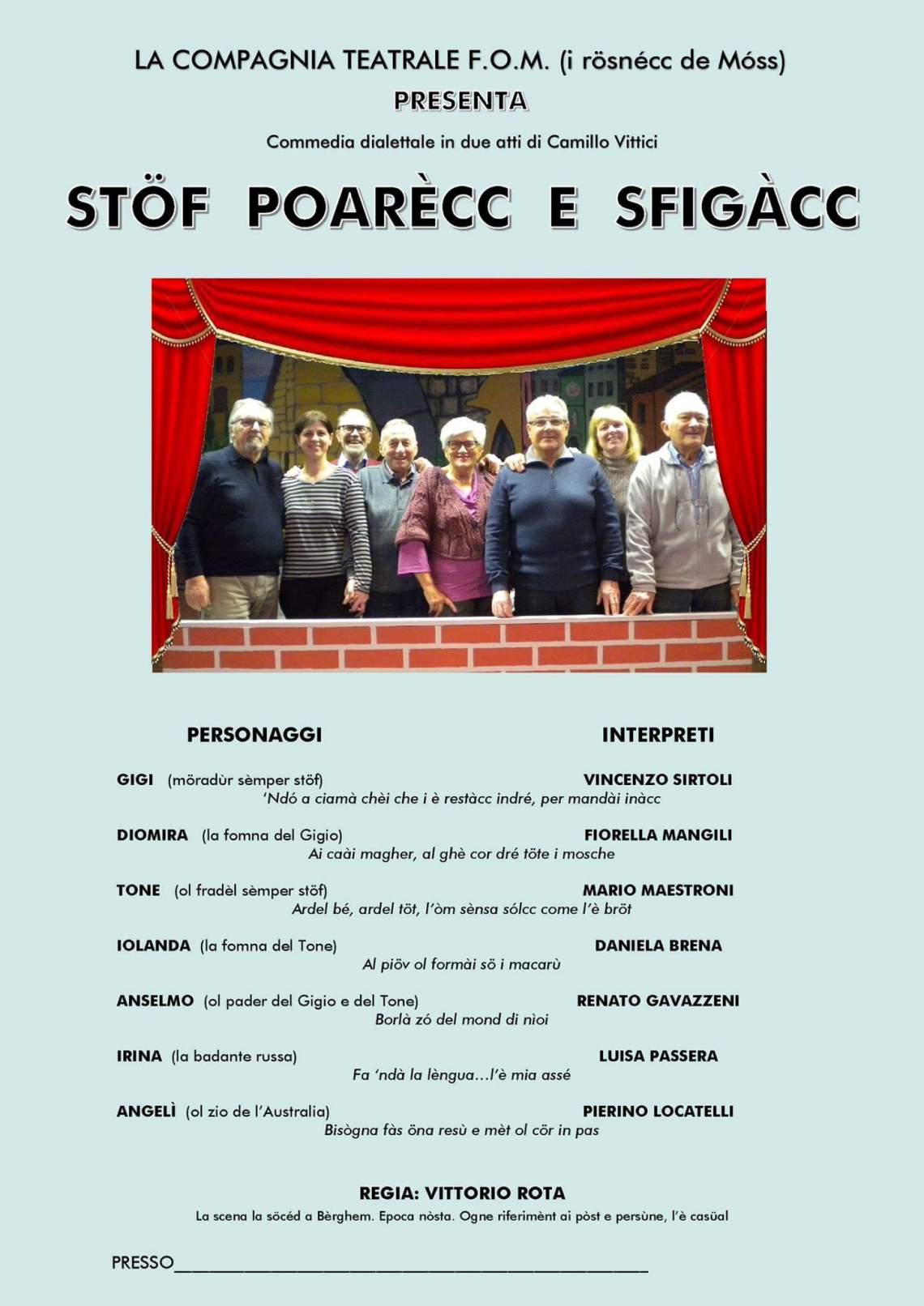 “In questi mesi il gruppo teatrale di Mozzo (F.O.M.) è impegnato nello studio e nelle prove per il debutto 2-3 aprile 2017 di questa fantastica commedia nella rassegna “töcc a teàter” di Mozzo”
