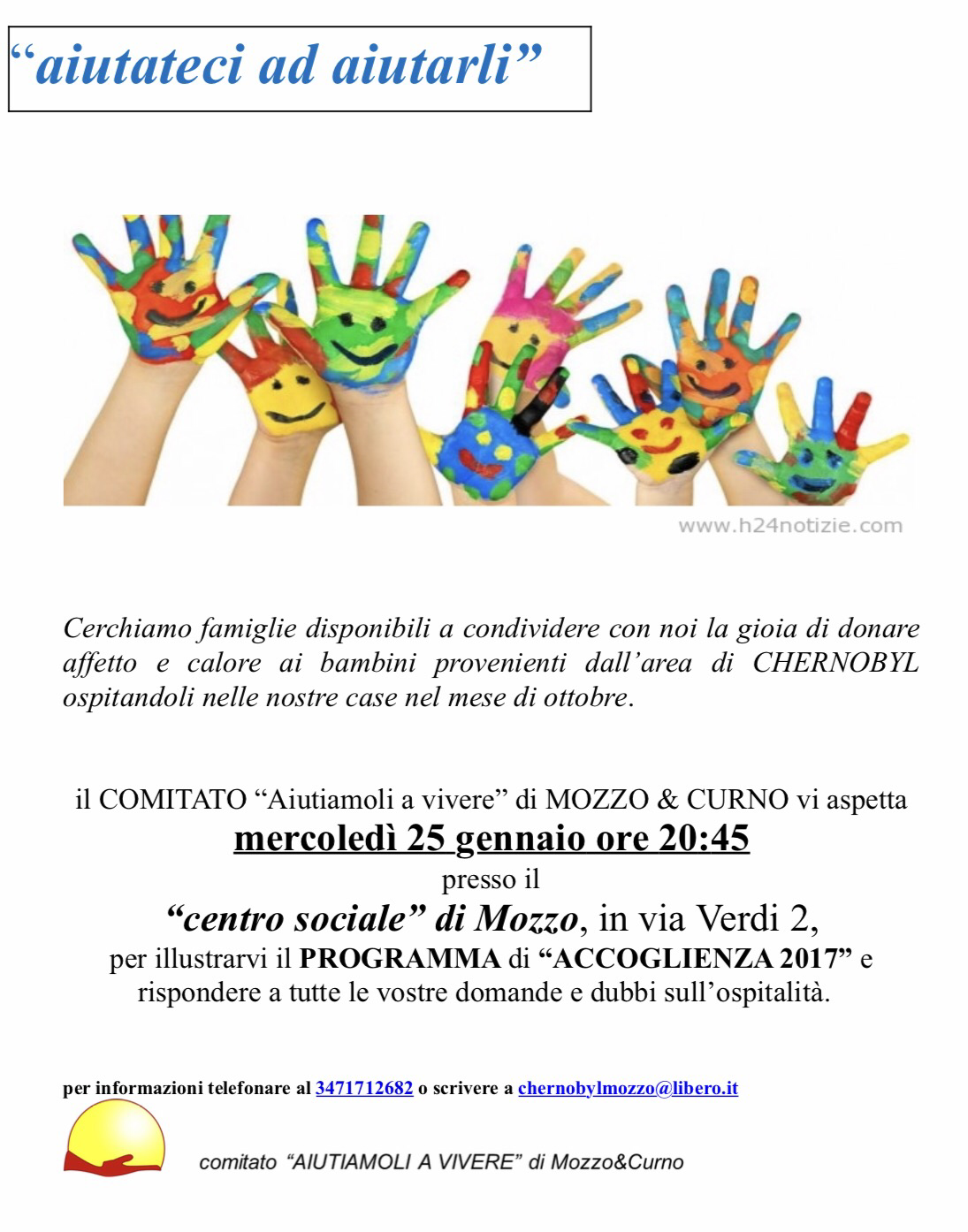Mozzo/Chernobyl: incontro presentazione accoglienza 2017 il 25 gennaio admin23 gennaio 201715 gennaio 2017blog post Navigazione articoli PrecedenteContinua Condividi:CondivisioneTweet Fai clic qui per stampare (Si apre in una nuova finestra) Stampa Fai clic per inviare un link a un amico via e-mail (Si apre in una nuova finestra) E-mail Mi piace Caricamento... Correlati