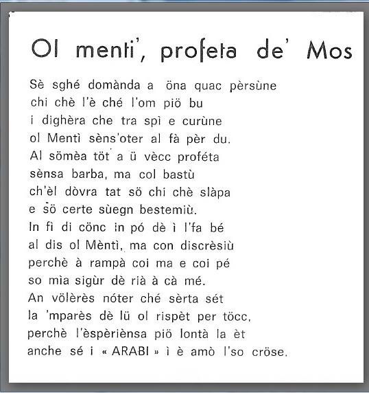 Morale della Favola: Il nostro MENTI’ visto da molti mozzesi come uomo stravagante,alcuni lo ritenevano addirittura un uomo pericoloso per via della falce che aveva sempre con se, invece all’infuori delle “prediche”che teneva al vento era un uomo buono, non ha mai fatto del danno ad alcuno. Purtroppo siamo stati noi che non abbiamo capito il dramma ,le sofferenze che ha subito quest’uomo nella sua gioventù portandolo da adulto a comportarsi come un uomo “stravagante”