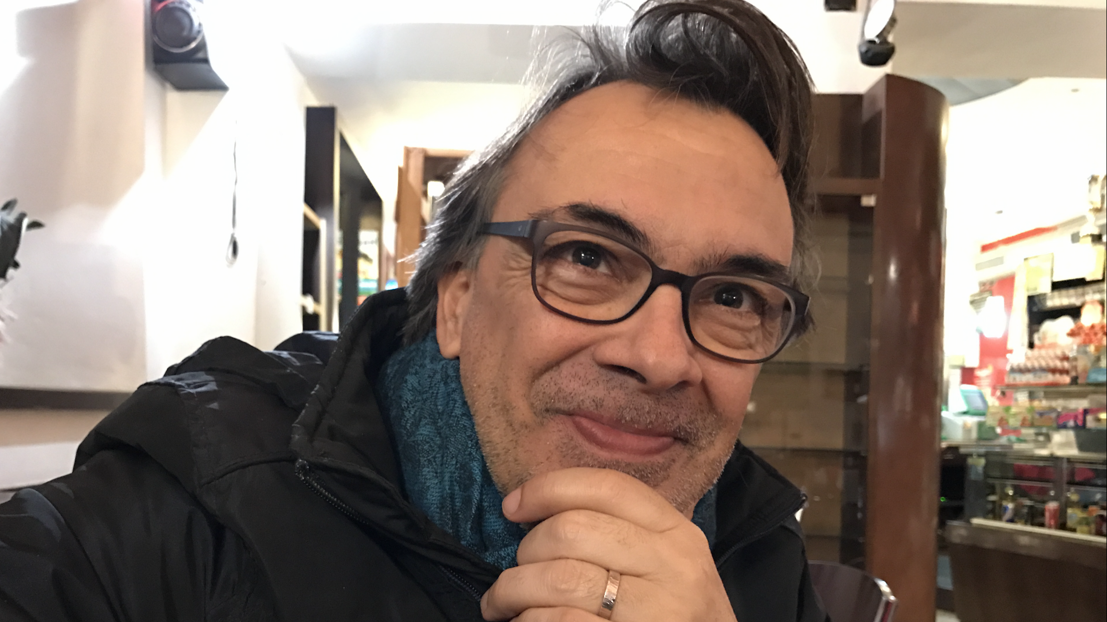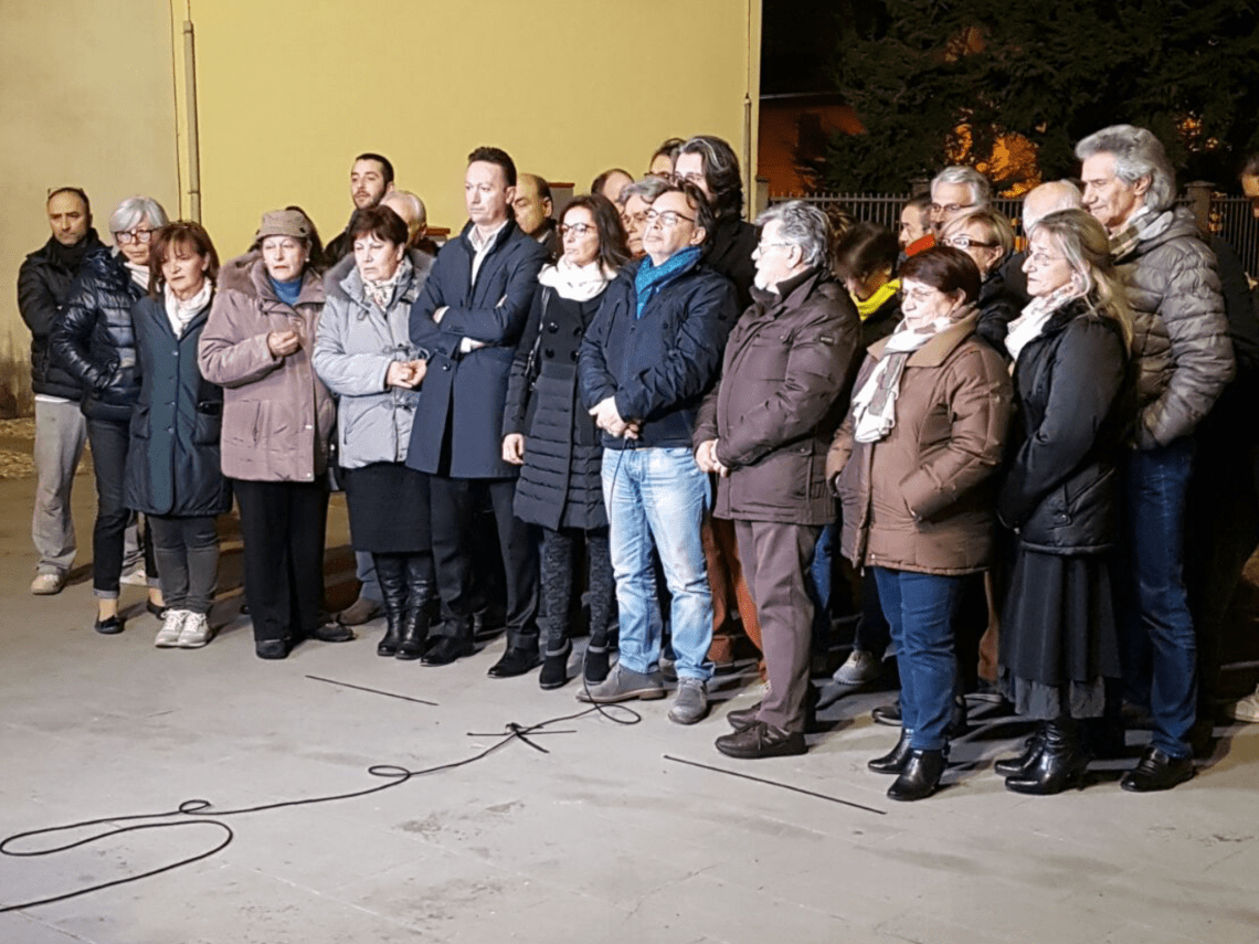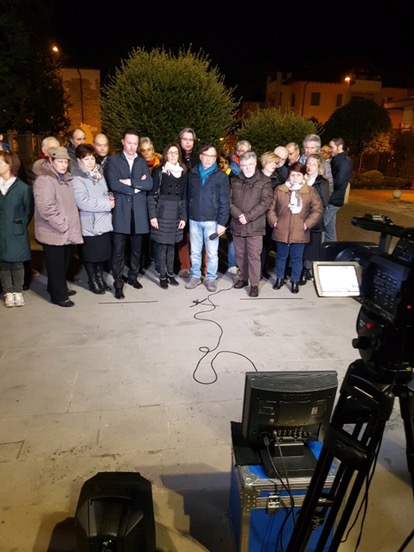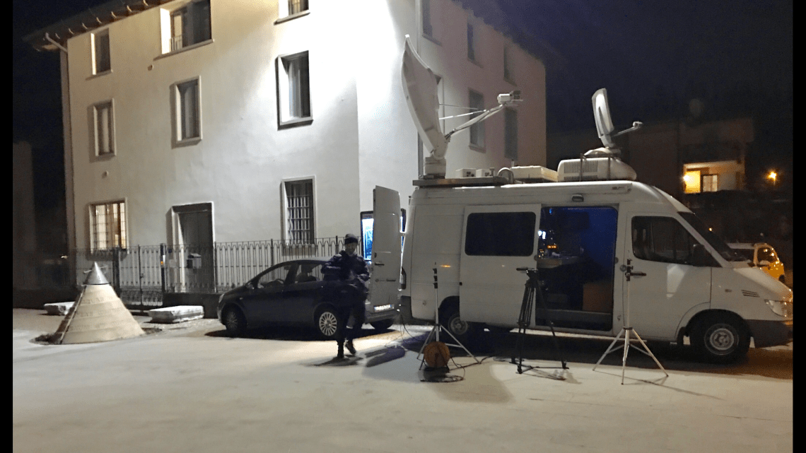 Il giornalista Mario Marchi, sul campo, davanti alla casa parrocchiale: