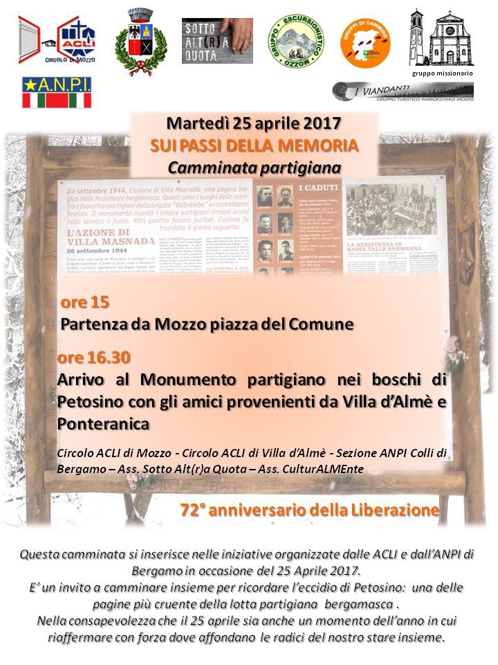 Mozzo/Acli: Camminata del 25 aprile admin20 aprile 2017blog post Navigazione articoli PrecedenteContinua Condividi:CondivisioneTweet Fai clic qui per stampare (Si apre in una nuova finestra) Stampa Fai clic per inviare un link a un amico via e-mail (Si apre in una nuova finestra) E-mail Mi piace Caricamento... Correlati