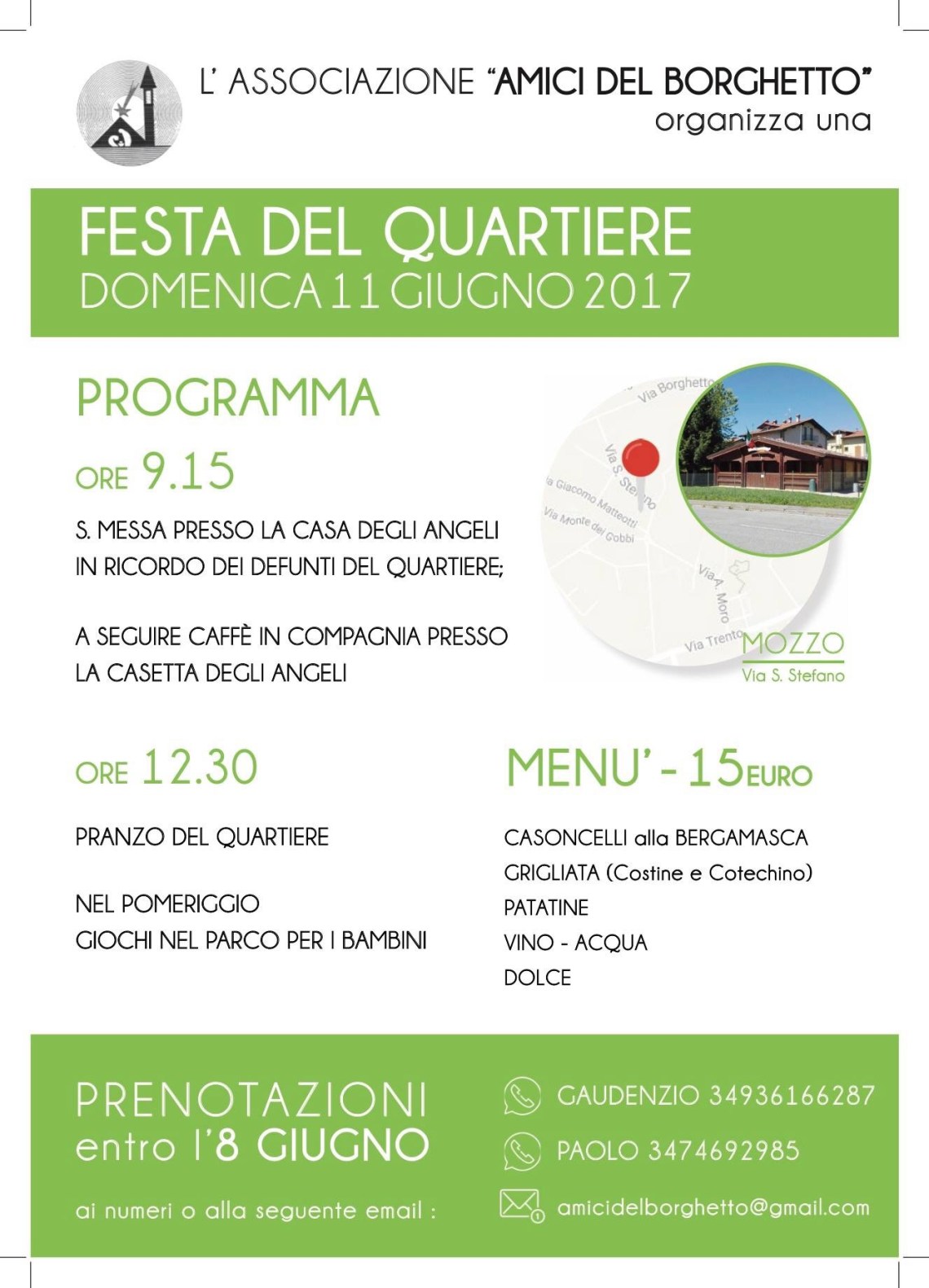 Mozzo/Borghetto: Festa del quartiere domenica 11 giugno admin5 giugno 201729 Maggio 2017blog post Navigazione articoli PrecedenteContinua Condividi:CondivisioneTweet Fai clic qui per stampare (Si apre in una nuova finestra) Stampa Fai clic per inviare un link a un amico via e-mail (Si apre in una nuova finestra) E-mail Mi piace Caricamento... Correlati