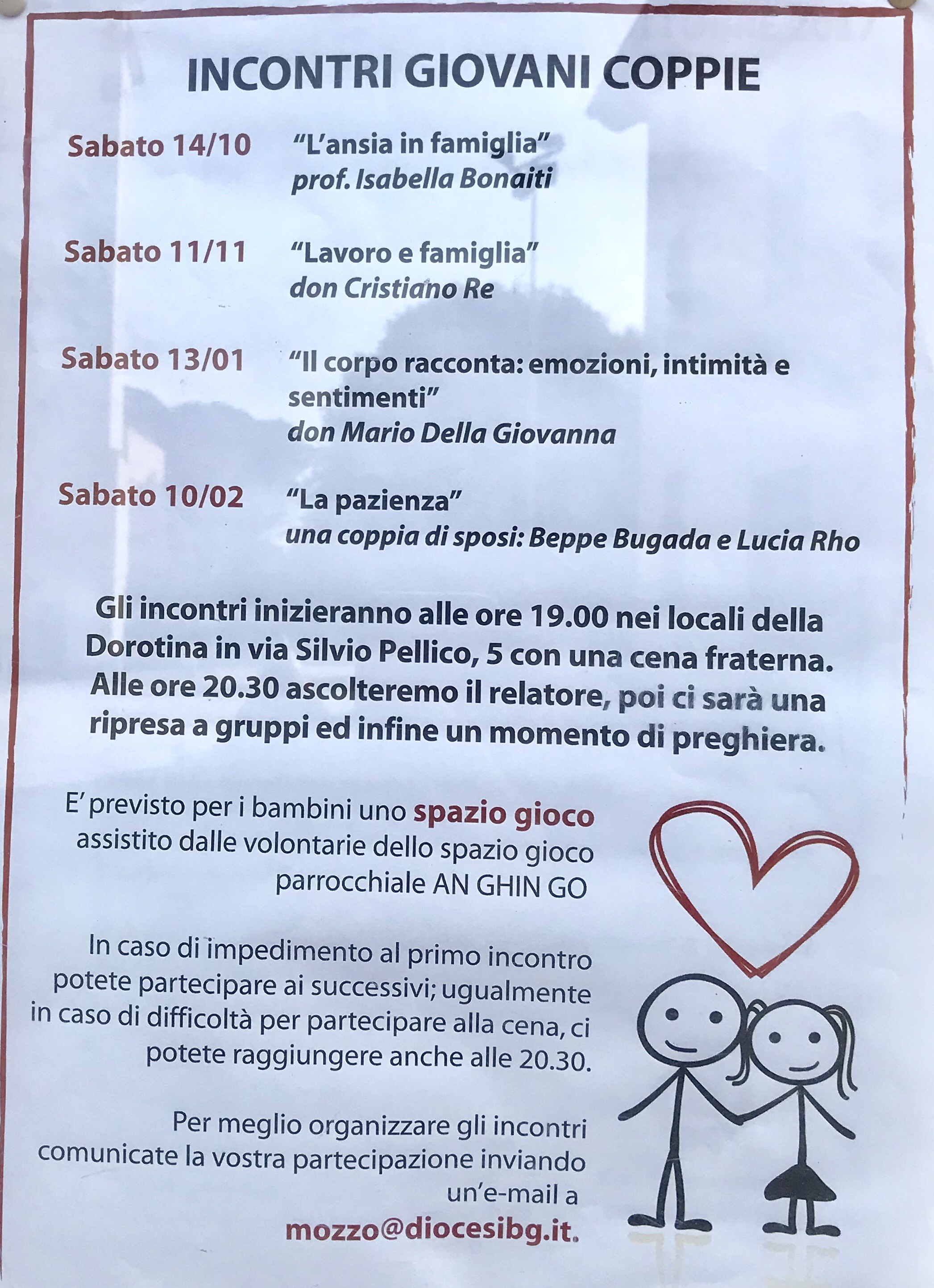 Mozzo/Parrocchia: incontri per giovani coppie dal 14 ottobre admin12 ottobre 2017blog post Navigazione articoli PrecedenteContinua Condividi:CondivisioneTweet Fai clic qui per stampare (Si apre in una nuova finestra) Stampa Fai clic per inviare un link a un amico via e-mail (Si apre in una nuova finestra) E-mail Mi piace Caricamento... Correlati