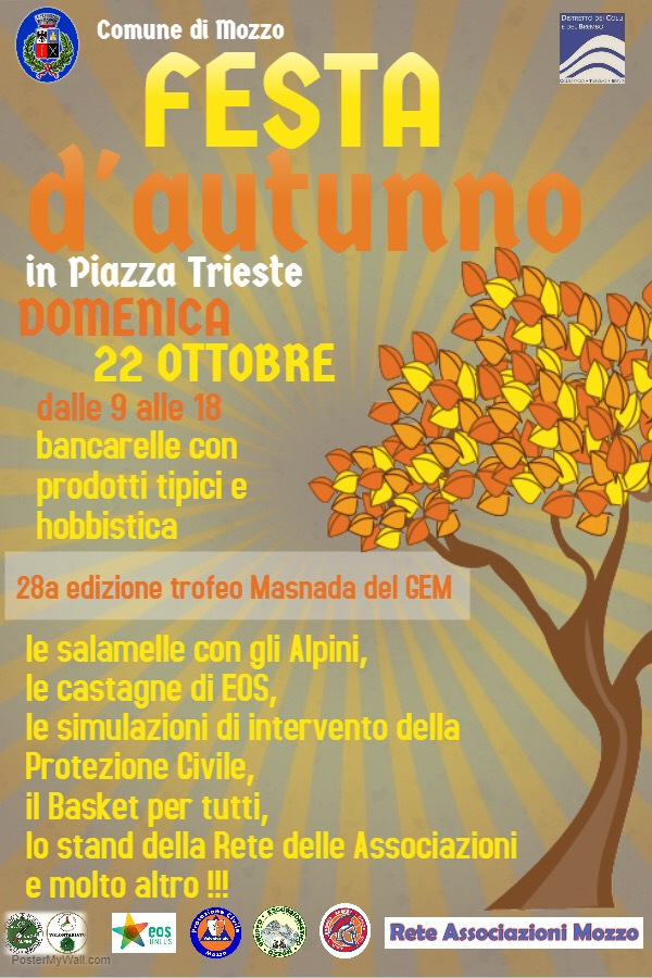 Mozzo: Festa autunno 2017 il 22 ottobre admin16 ottobre 201711 ottobre 2017blog post Navigazione articoli PrecedenteContinua Articolo Immagine. Sorgente: Festa autunno 2017 Condividi:CondivisioneTweet Fai clic qui per stampare (Si apre in una nuova finestra) Stampa Fai clic per inviare un link a un amico via e-mail (Si apre in una nuova finestra) E-mail Mi piace Caricamento... Correlati