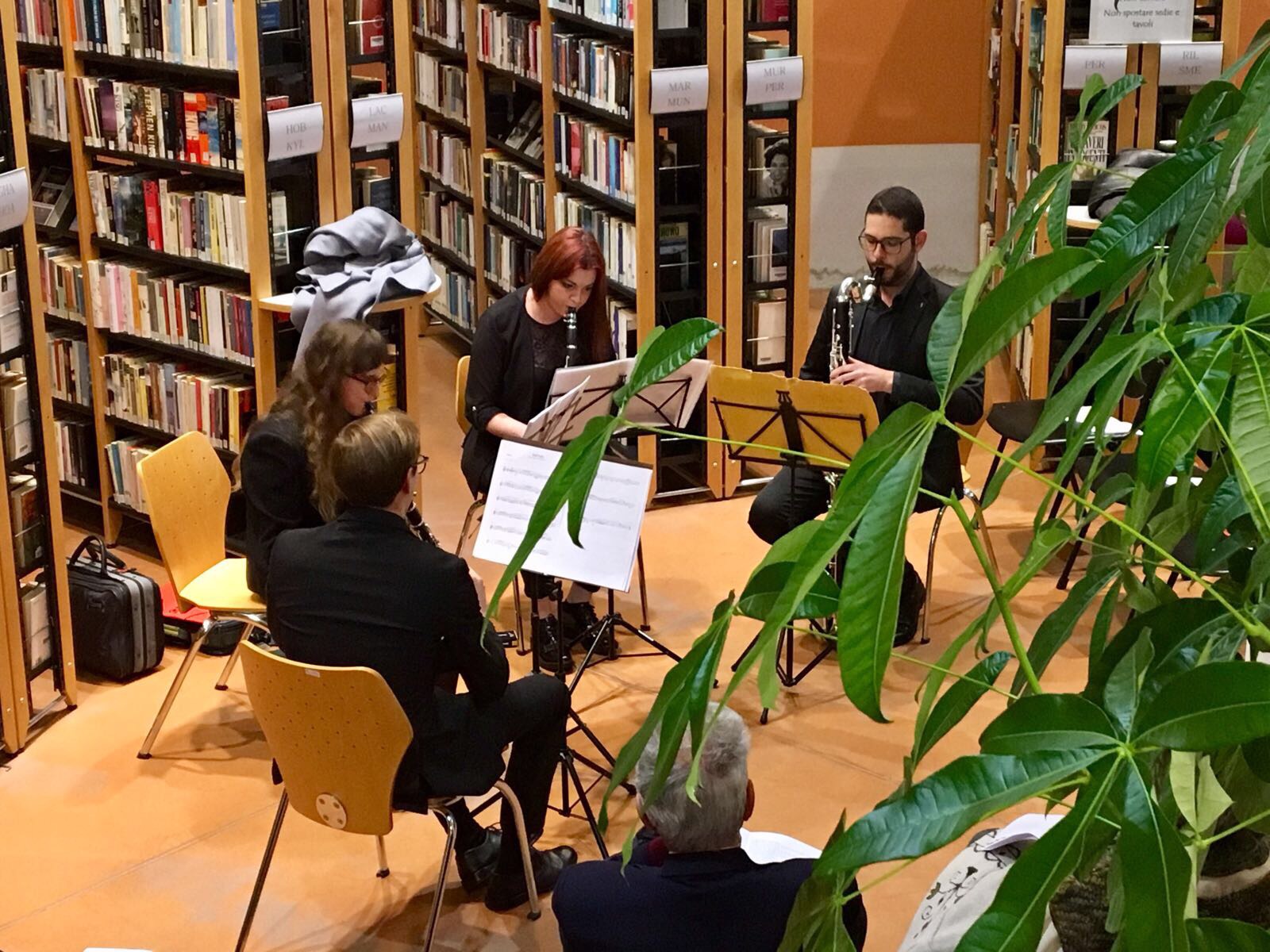 Musica d’eccellenza tra i libri della biblioteca con il Quartetto di clarinetti di Bergamo. Repertorio di qualità che ha toccato/viaggiato in vari paesi del mondo con diversi generi musicali.