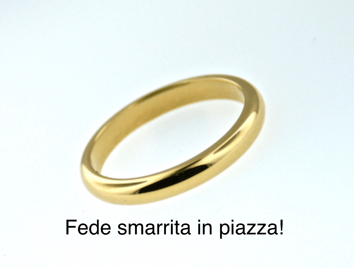 “smarrita fede nuziale stamattina in chiesa e poi a catechismo perciò zona chiesa. All’ interno ci sono i nomi Saverio Norma e la data 26 12 1964. Purtroppo Norma è mancata due mesi fa e la vera per Saverio è ancora più importante del solito.”