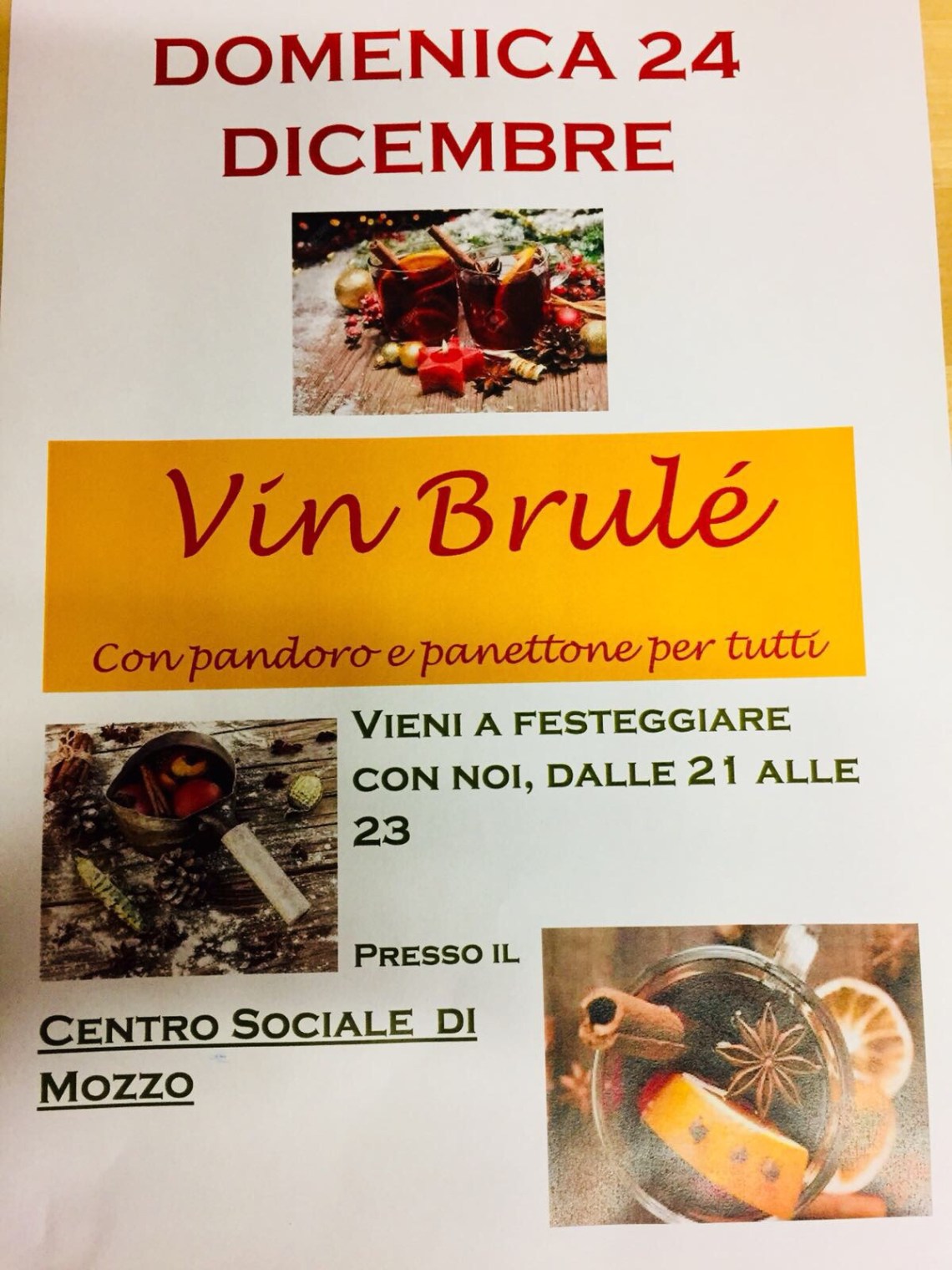 Mozzo/Centro sociale: vin brûlé il 24 dicembre admin21 dicembre 2017blog post Navigazione articoli PrecedenteContinua Condividi:CondivisioneTweet Fai clic qui per stampare (Si apre in una nuova finestra) Stampa Fai clic per inviare un link a un amico via e-mail (Si apre in una nuova finestra) E-mail Mi piace Caricamento... Correlati
