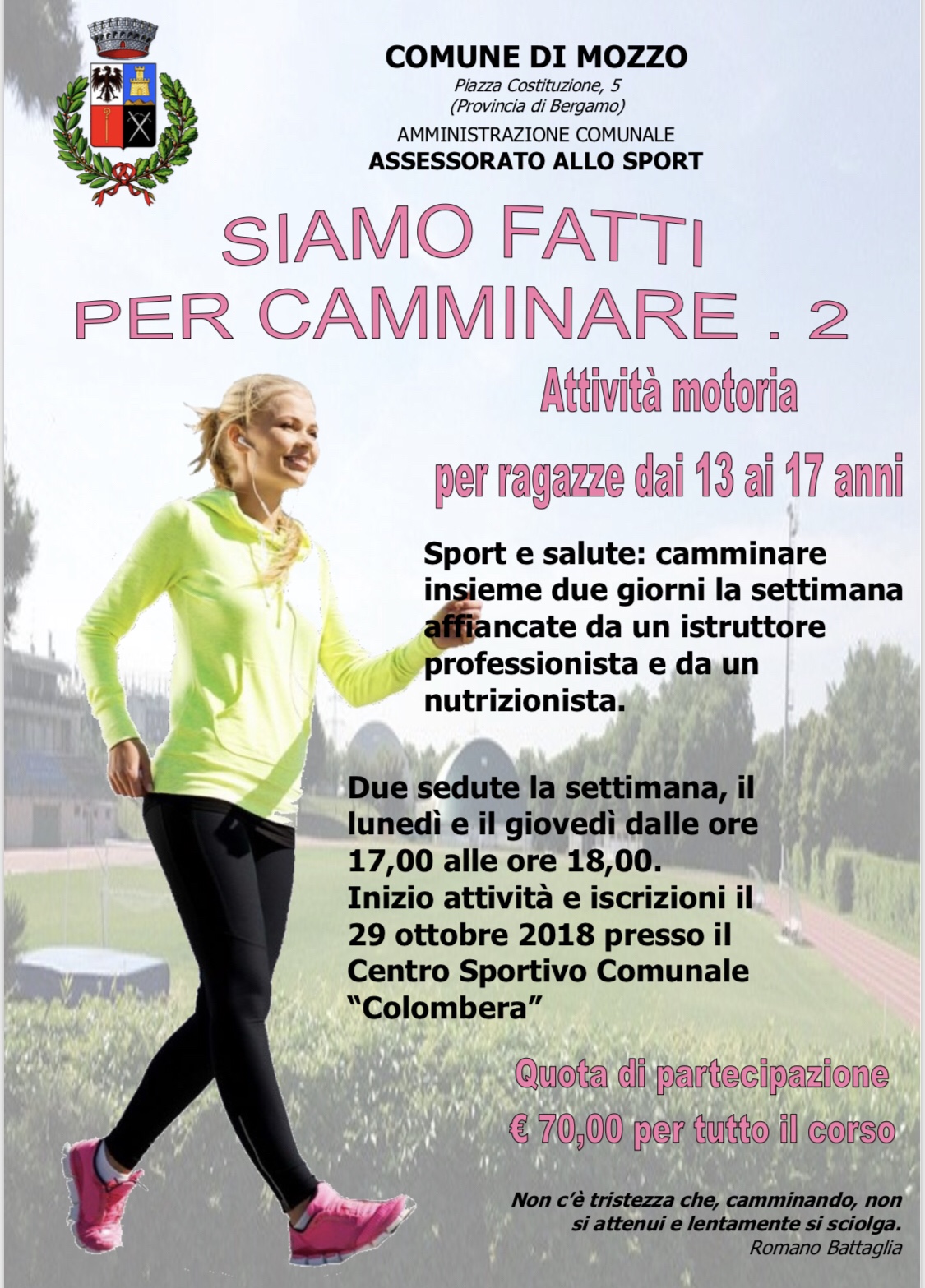 Mozzo/Sport: Siamo fatti per camminare dal 29 ottobre admin23 ottobre 2018blog post Navigazione articoli PrecedenteContinua Condividi:CondivisioneTweet Fai clic qui per stampare (Si apre in una nuova finestra) Stampa Fai clic per inviare un link a un amico via e-mail (Si apre in una nuova finestra) E-mail Mi piace Caricamento... Correlati