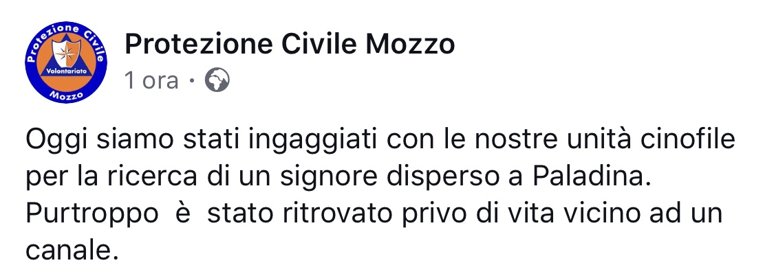 Mozzo/Protezione civile: “ ingaggiati per ricerca disperso di Paladina. Purtroppo ritrovato non in vita” admin25 novembre 201825 novembre 2018blog post Navigazione articoli PrecedenteContinua Condividi:CondivisioneTweet Fai clic qui per stampare (Si apre in una nuova finestra) Stampa Fai clic per inviare un link a un amico via e-mail (Si apre in una nuova finestra) E-mail Mi piace Caricamento... Correlati