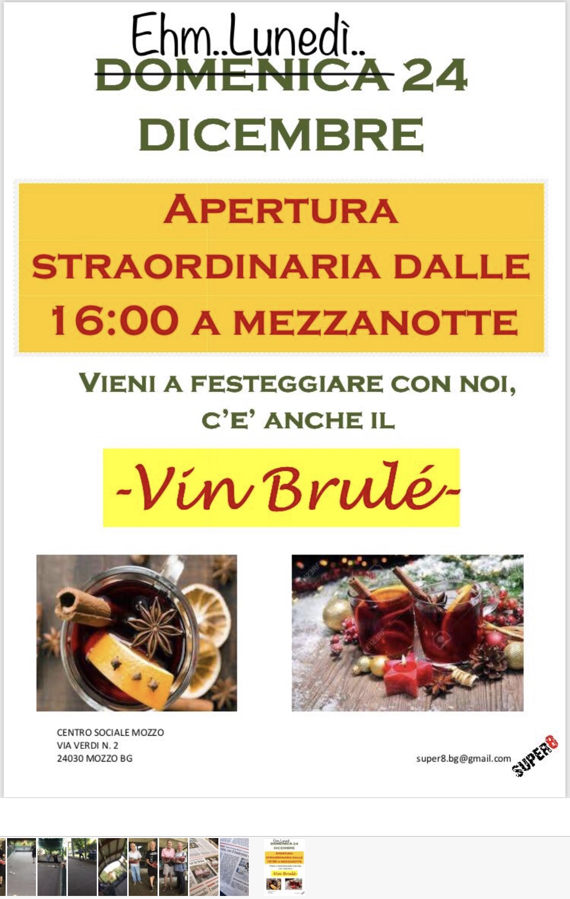 Mozzo: Vin Brule’ lunedi sera fino a mezzanotte… admin22 dicembre 201822 dicembre 2018blog post Navigazione articoli PrecedenteContinua Condividi:CondivisioneTweet Fai clic qui per stampare (Si apre in una nuova finestra) Stampa Fai clic per inviare un link a un amico via e-mail (Si apre in una nuova finestra) E-mail Mi piace Caricamento... Correlati