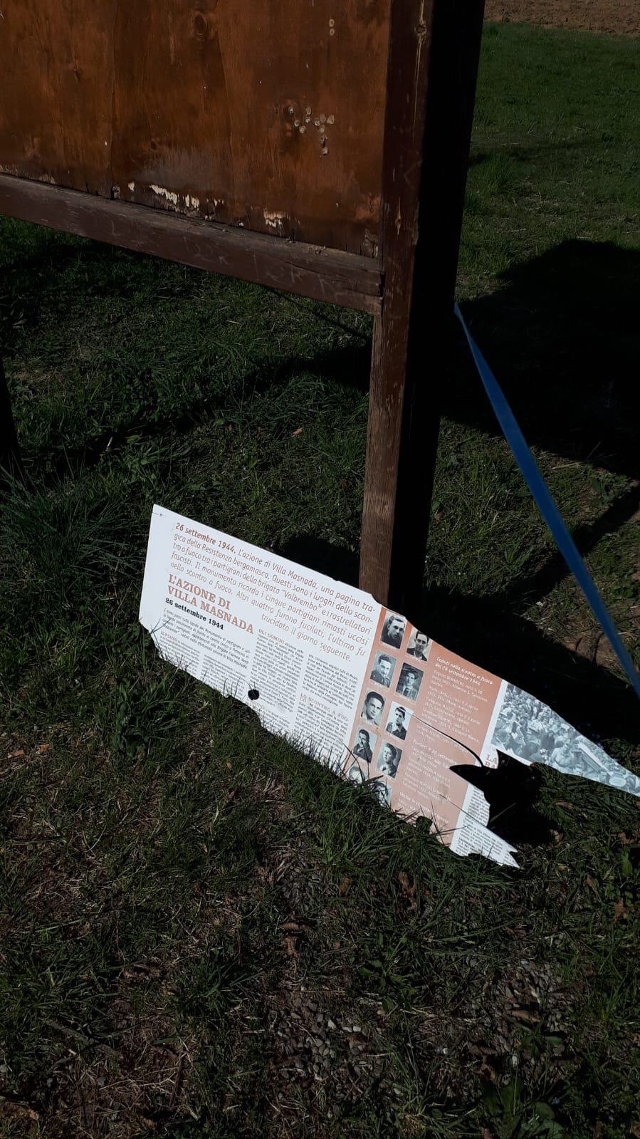 Ancora un fatto vandalico ad uno dei simboli della memoria partigiana, il cartellone che ricorda l’azione di Villa Masnada, presenti sul nostro territorio.