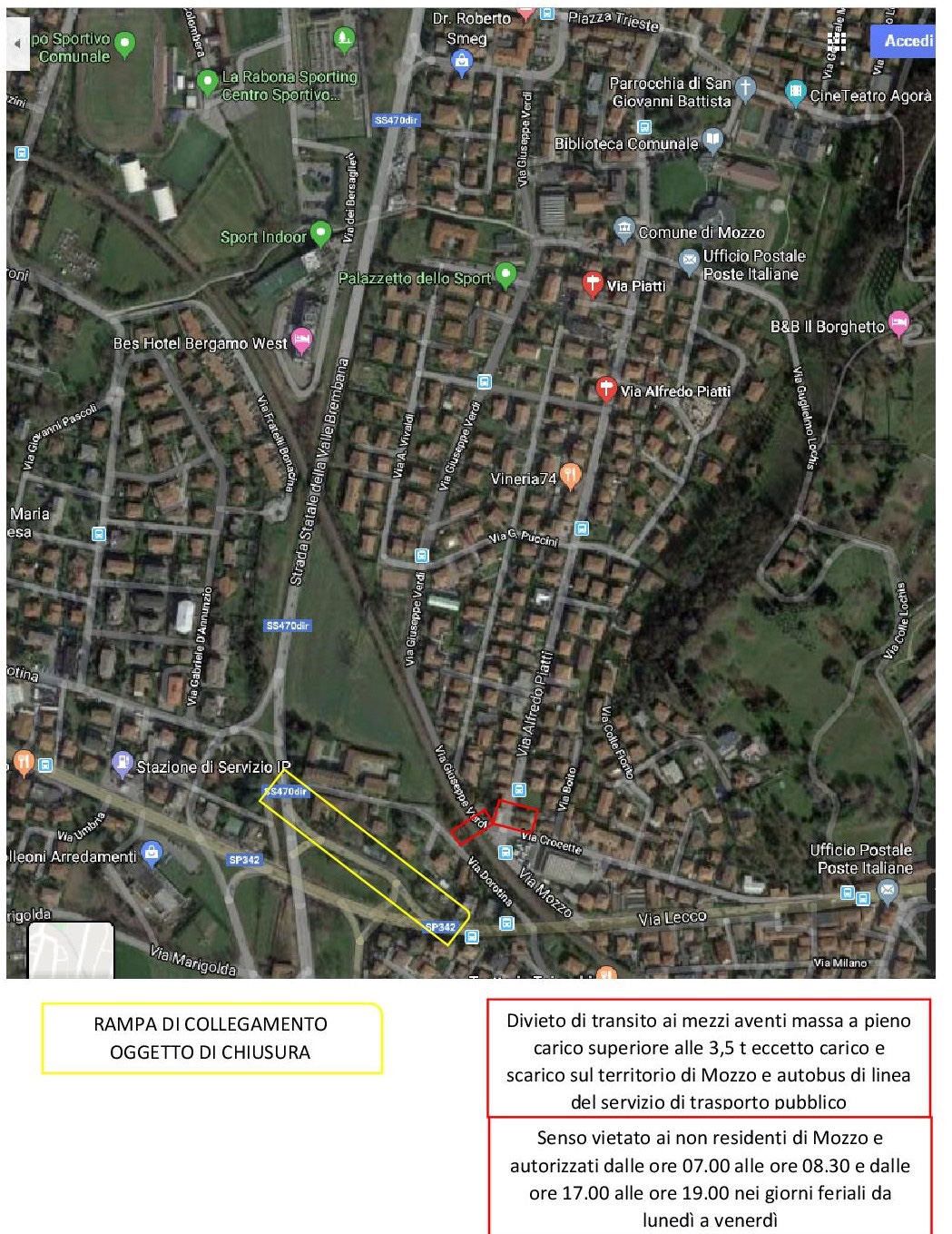 2.Istituzione del divieto di transito ai veicoli aventi massa a pieno carico superiore alle 3,5 t con validità 0-24 lungo le vie Piatti e Verdi nel tratto compreso dall’intersezione con via Crocette fino all’intersezione con Piazza Trieste e con via della Mola, nelle direttrici di marcia provenienza via Lecco – Curno e direzione Mozzo Centro, fatta eccezione alle attività di carico e scarico sul territorio di Mozzo e agli autobus di linea del servizio di trasporto pubblico.Comune di Mozzo