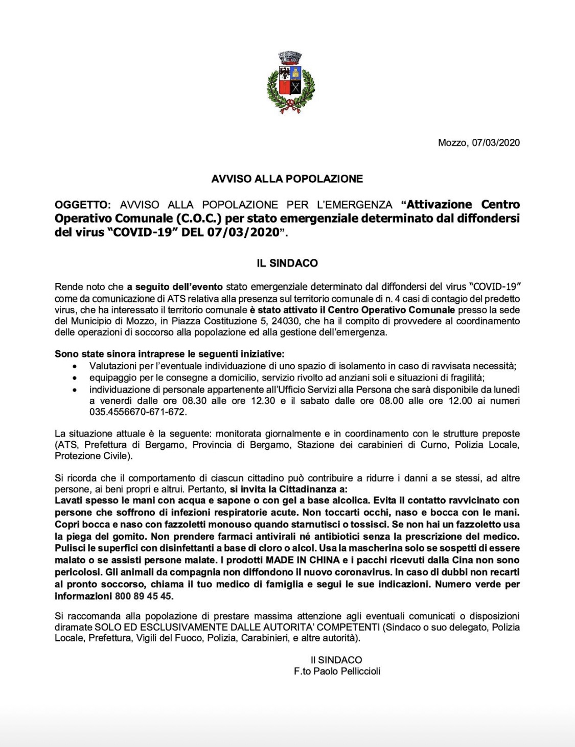 Mozzo/#Coronavirus: attivazione centro operativo comunale admin7 marzo 2020blog post Navigazione articoli PrecedenteContinua Condividi:CondivisioneTweet Fai clic qui per stampare (Si apre in una nuova finestra) Stampa Fai clic per inviare un link a un amico via e-mail (Si apre in una nuova finestra) E-mail Mi piace Caricamento... Correlati