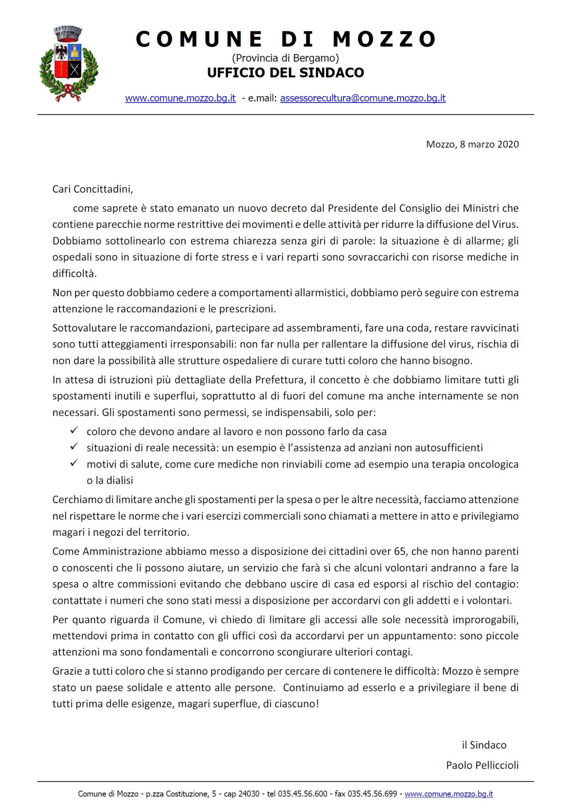 Mozzo/Comune: comunicato del Sindaco admin8 marzo 20209 marzo 2020blog post Navigazione articoli PrecedenteContinua Comunicazione Regione Lombardia ore 18,00: Mozzo 7 contagiati. Condividi:CondivisioneTweet Fai clic qui per stampare (Si apre in una nuova finestra) Stampa Fai clic per inviare un link a un amico via e-mail (Si apre in una nuova finestra) E-mail Mi piace Caricamento... Correlati