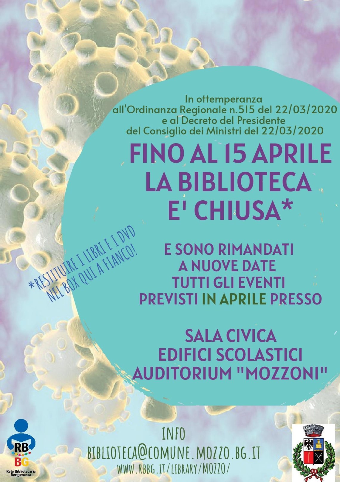 Mozzo/Biblioteca: chiusura fino al 15 aprile. admin3 aprile 2020blog post Navigazione articoli PrecedenteContinua Condividi:CondivisioneTweet Fai clic qui per stampare (Si apre in una nuova finestra) Stampa Fai clic per inviare un link a un amico via e-mail (Si apre in una nuova finestra) E-mail Mi piace Caricamento... Correlati