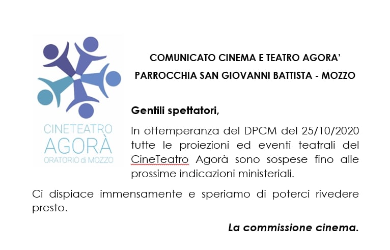 Mozzo/Cinema Agora’: sospese le proiezioni admin28 ottobre 202027 ottobre 2020blog post Navigazione articoli PrecedenteContinua Condividi:CondivisioneTweet Fai clic qui per stampare (Si apre in una nuova finestra) Stampa Fai clic per inviare un link a un amico via e-mail (Si apre in una nuova finestra) E-mail Mi piace Caricamento... Correlati