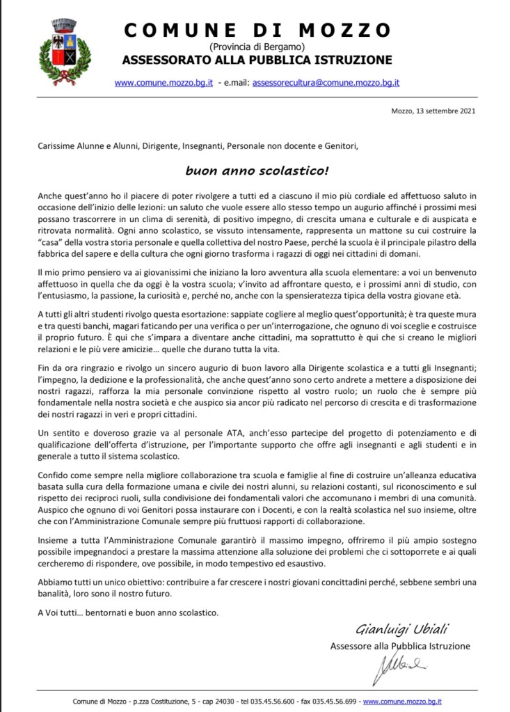 Mozzo/Scuola: al via le lezioni…., admin13 settembre 2021blog post Navigazione articoli PrecedenteContinua Condividi:CondivisioneTweet Fai clic qui per stampare (Si apre in una nuova finestra) Stampa Fai clic per inviare un link a un amico via e-mail (Si apre in una nuova finestra) E-mail Mi piace Caricamento... Correlati