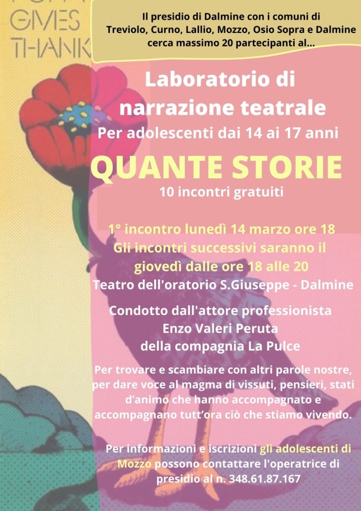 Mozzo/Ado: Laboratorio di narrazione teatrale per adolescenti dai 14 ai 17 anni|Comune di Mozzo admin24 febbraio 202223 febbraio 2022blog post Navigazione articoli PrecedenteContinua Laboratorio di narrazione teatrale per adolescenti dai 14 ai 17 anniComune di Mozzo Condividi:CondivisioneTweet Fai clic qui per stampare (Si apre in una nuova finestra) Stampa Fai clic per inviare un link a un amico via e-mail (Si apre in una nuova finestra) E-mail Mi piace Caricamento... Correlati