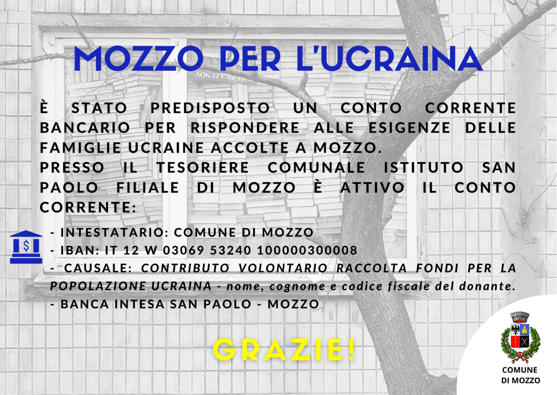 MOZZO PER L’UCRAINA – DONAZIONI |Comune di Mozzo admin29 marzo 202231 marzo 2022blog post Navigazione articoli PrecedenteContinua MOZZO PER L’UCRAINA – DONAZIONI — Leggi su www.comune.mozzo.bg.it/c016143/po/mostra_news.php Condividi:CondivisioneTweet Fai clic qui per stampare (Si apre in una nuova finestra) Stampa Fai clic per inviare un link a un amico via e-mail (Si apre in una nuova finestra) E-mail Mi piace Caricamento... Correlati