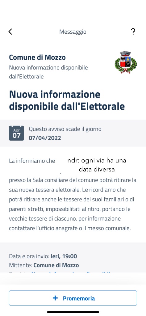 Mozzo/Elezioni: l’App Io ti avvisa che c’è’ posta per te dal comune (esempio) admin8 aprile 202215 aprile 2022blog post Navigazione articoli PrecedenteContinua Ogni via di residenza ha data diversa. L immagine rappresenta l’avviso della via Piatti. Condividi:CondivisioneTweet Fai clic qui per stampare (Si apre in una nuova finestra) Stampa Fai clic per inviare un link a un amico via e-mail (Si apre in una nuova finestra) E-mail Mi piace Caricamento... Correlati