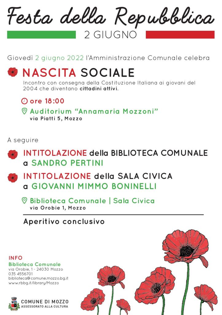 Mozzo/ 2 Giugno: Festa Repubblica, Cittadinanza, intitolazione biblioteca e sala civica. admin31 Maggio 202228 Maggio 2022blog post Navigazione articoli PrecedenteContinua Condividi:CondivisioneTweet Fai clic qui per stampare (Si apre in una nuova finestra) Stampa Fai clic per inviare un link a un amico via e-mail (Si apre in una nuova finestra) E-mail Mi piace Caricamento... Correlati