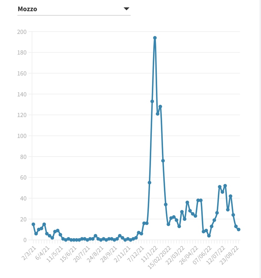 Il tasso di incidenza del Covid nella Bergamasca, nella settimana 24-30 agosto 2022, è pari a 184 nuovi casi per 100.000 abitanti (ovvero 1,84 per 1.000, nella metrica utilizzata a livello di singoli comuni).