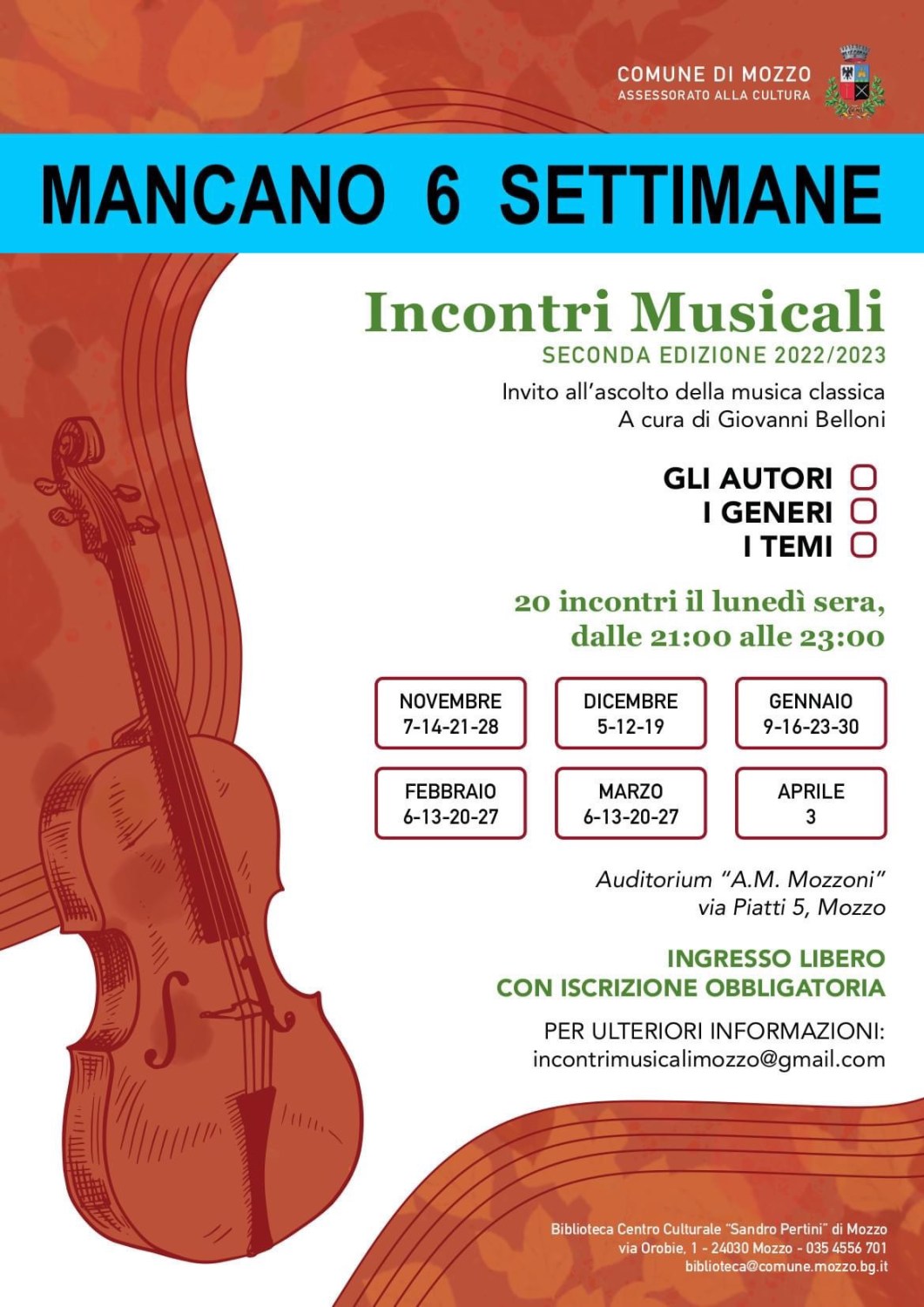 Mozzo/Musica: Incontri Musicali da 7 novembre admin3 ottobre 20227 ottobre 2022blog post Navigazione articoli PrecedenteContinua Condividi:CondivisioneTweet Fai clic qui per stampare (Si apre in una nuova finestra) Stampa Fai clic per inviare un link a un amico via e-mail (Si apre in una nuova finestra) E-mail Mi piace Caricamento... Correlati