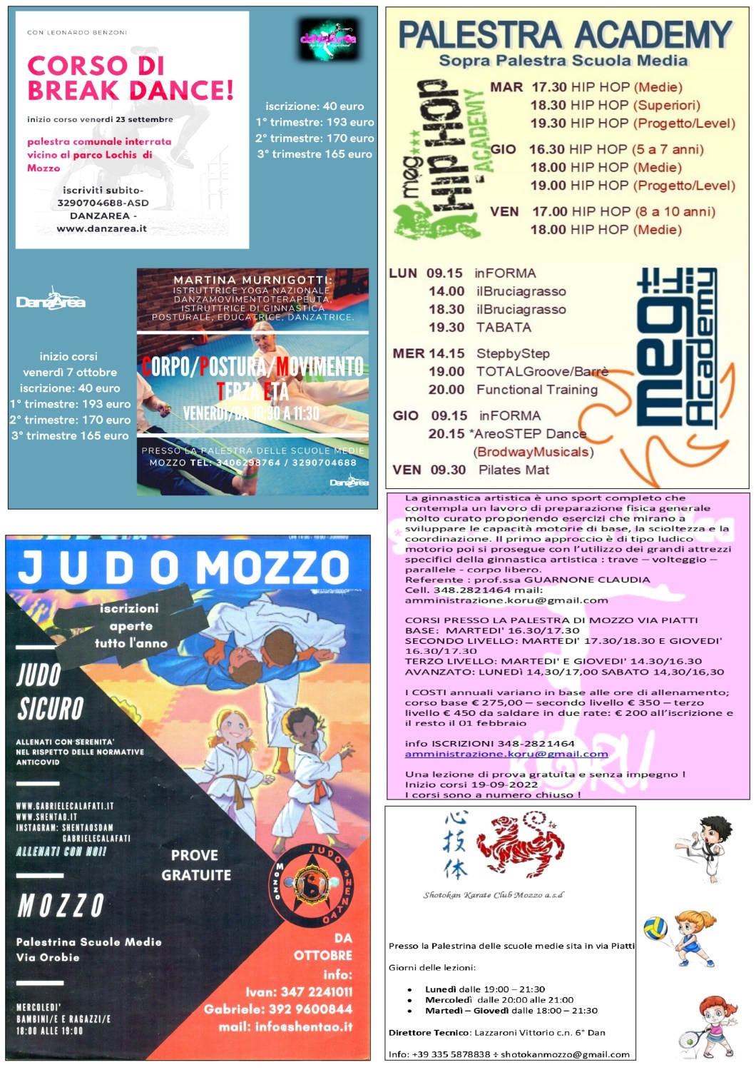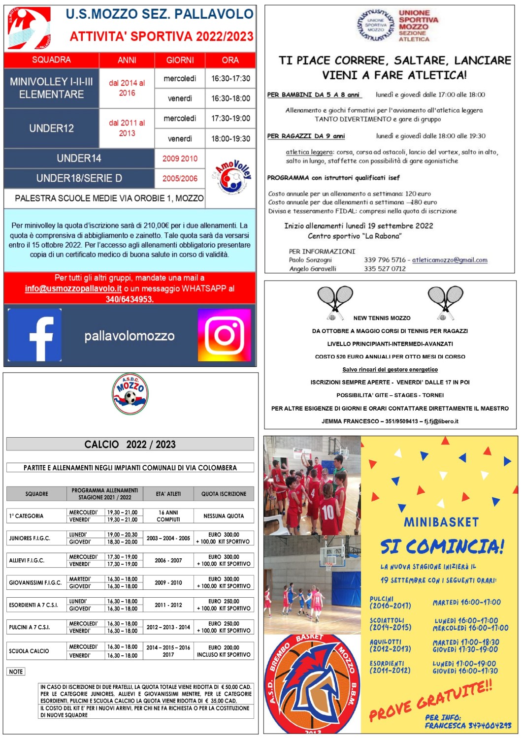 Anche quest’anno l’Amministrazione Comunale attiva l’iniziativa Contributi alle famigle per lo sport, un sostegno per le spese di frequenza alle attività sportive. La domanda si presenta compilando l’apposito modulo (vedi allegati), ecco i requisiti che i figli devono possedere:- Avere età compresa tra i 6 anni (2016) e i 16 anni (2006) ed essere residente a Mozzo;- Essere iscritto/a ad un’attività sportiva della durata continuativa di almeno otto mesi e organizzata da una società sportiva di Mozzo;- Praticare l’attività sportiva per l’anno 2022/2023 nelle strutture di proprietà del Comune.