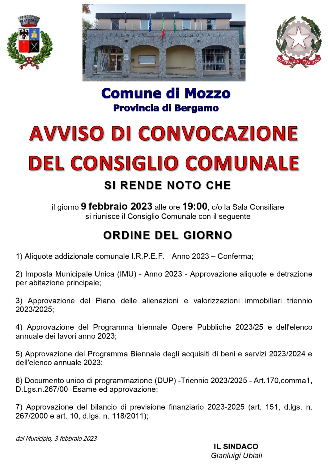 CONVOCAZIONE CONSIGLIO COMUNALE 9 febbraio ore 19 |Comune di Mozzo admin6 febbraio 20236 febbraio 2023blog post Navigazione articoli PrecedenteContinua CONVOCAZIONE CONSIGLIO COMUNALE Comune di Mozzo Condividi:CondivisioneTweet Fai clic qui per stampare (Si apre in una nuova finestra) Stampa Fai clic per inviare un link a un amico via e-mail (Si apre in una nuova finestra) E-mail Mi piace Caricamento... Correlati