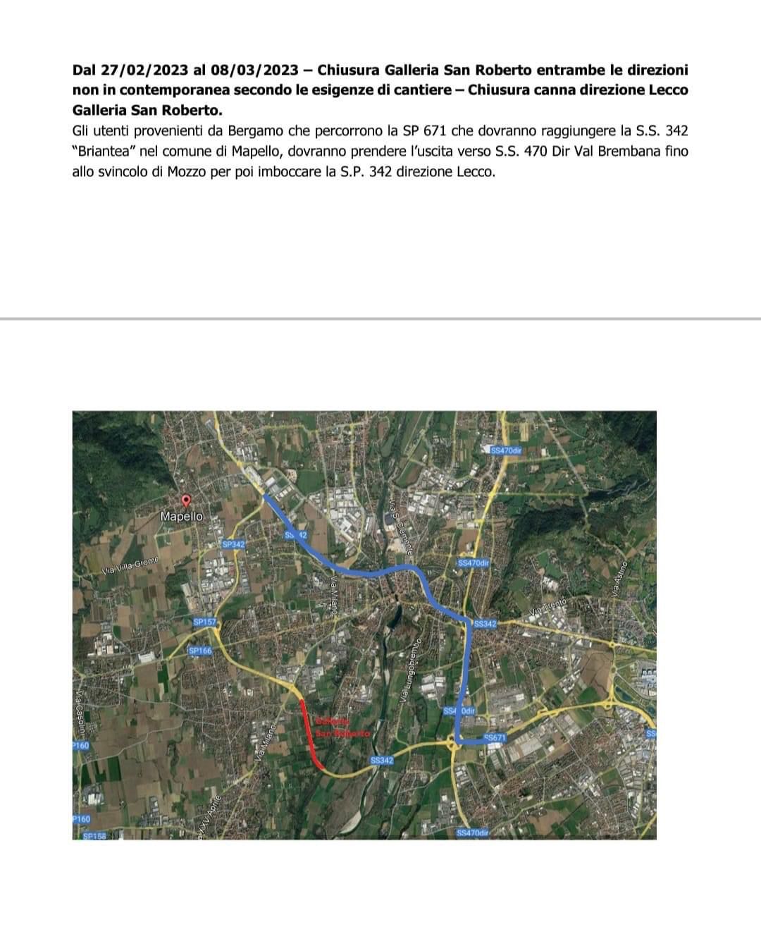 Gli utenti che, da Bergamo, lungo la strada provinciale 671 devono raggiungere la Briantea a Mapello, dovranno prendere l’uscita verso la strada statale 470 direzione Val Brembana fino allo svincolo di Mozzo, poi imboccare la strada provinciale 342 in direzione Lecco.