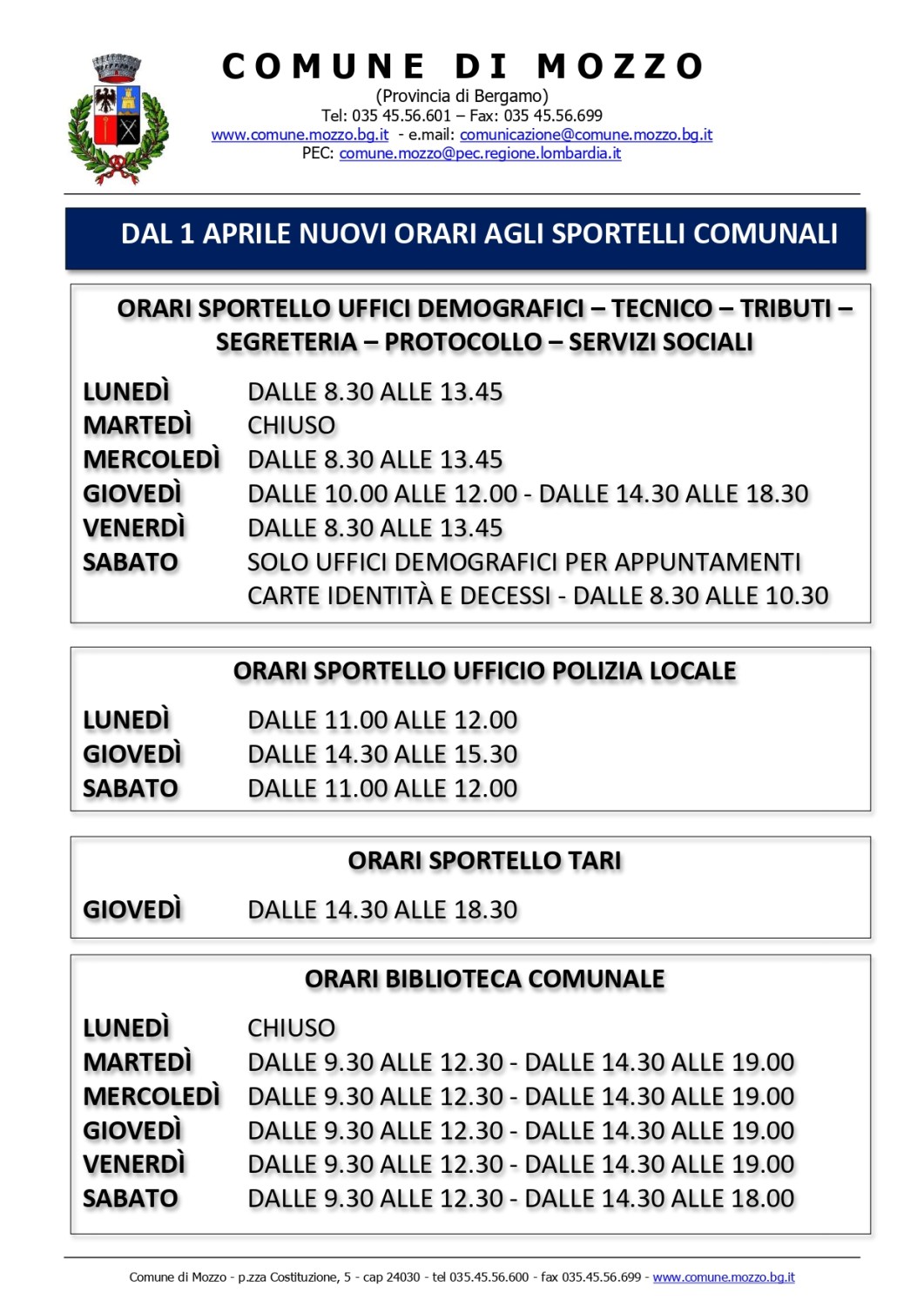 DAL PRIMO APRILE CAMBIANO GLI ORARI DEGLI SPORTELLI COMUNALI|Comune di Mozzo admin28 marzo 202327 marzo 2023blog post Navigazione articoli PrecedenteContinua DAL PRIMO APRILE CAMBIANO GLI ORARI DEGLI SPORTELLI COMUNALI Comune di Mozzo Condividi:CondivisioneTweet Fai clic qui per stampare (Si apre in una nuova finestra) Stampa Fai clic per inviare un link a un amico via e-mail (Si apre in una nuova finestra) E-mail Mi piace Caricamento... Correlati