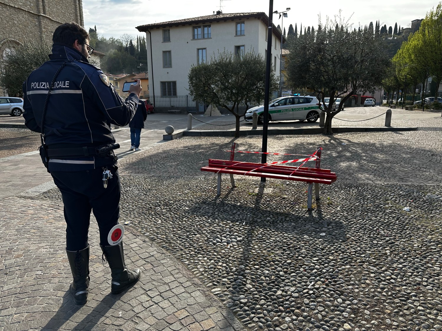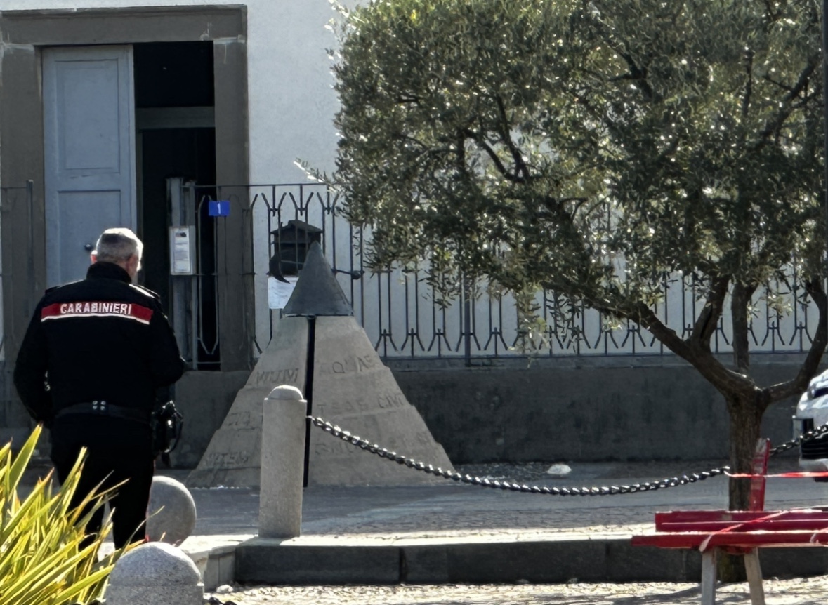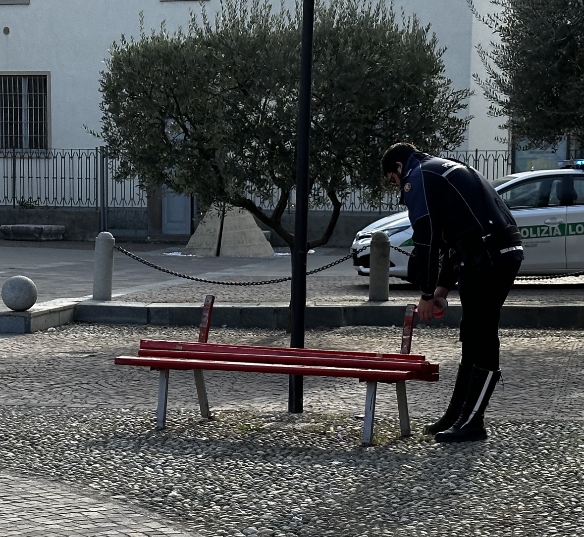 Danneggiata panchina, rotto vetro bacheca parrocchiale, sporcato vialetto verso chiesina di Lourdes, con polvere estintore.