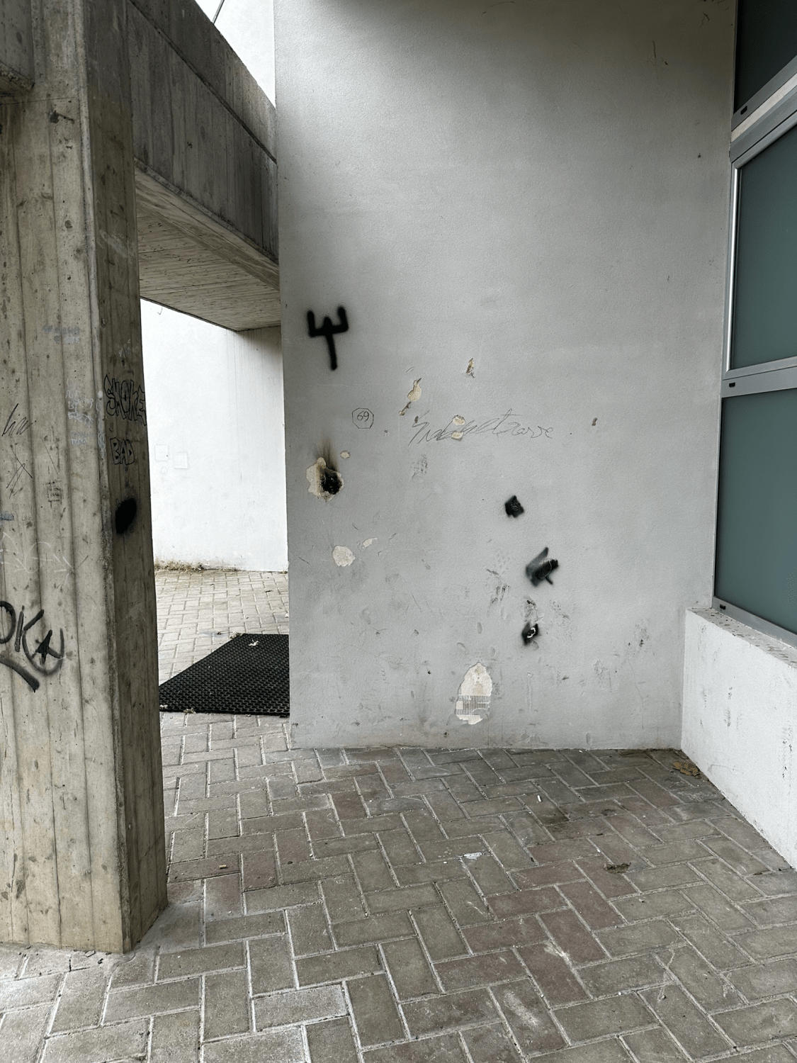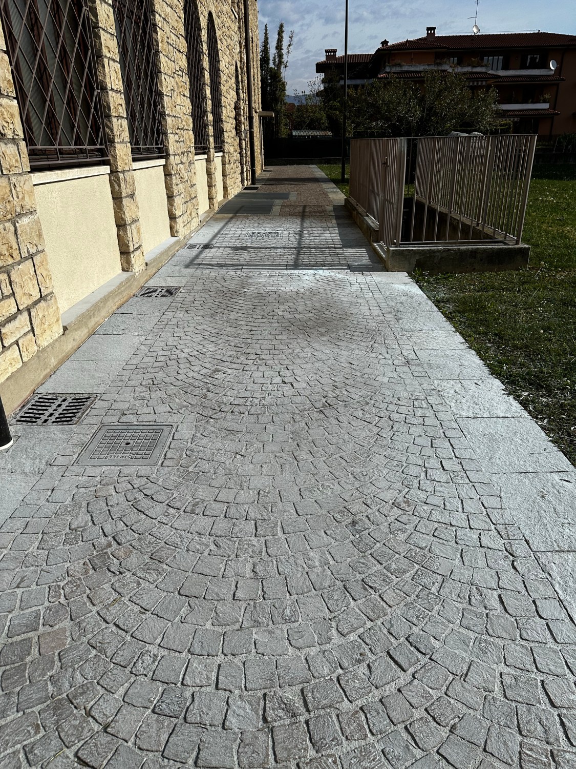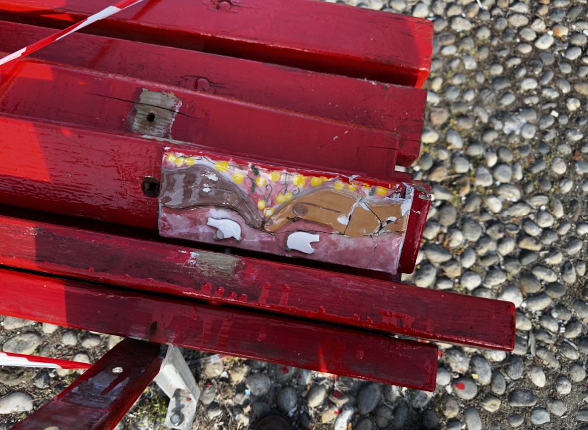 Danneggiata panchina, rotto vetro bacheca parrocchiale, sporcato vialetto verso chiesina di Lourdes, con polvere estintore.