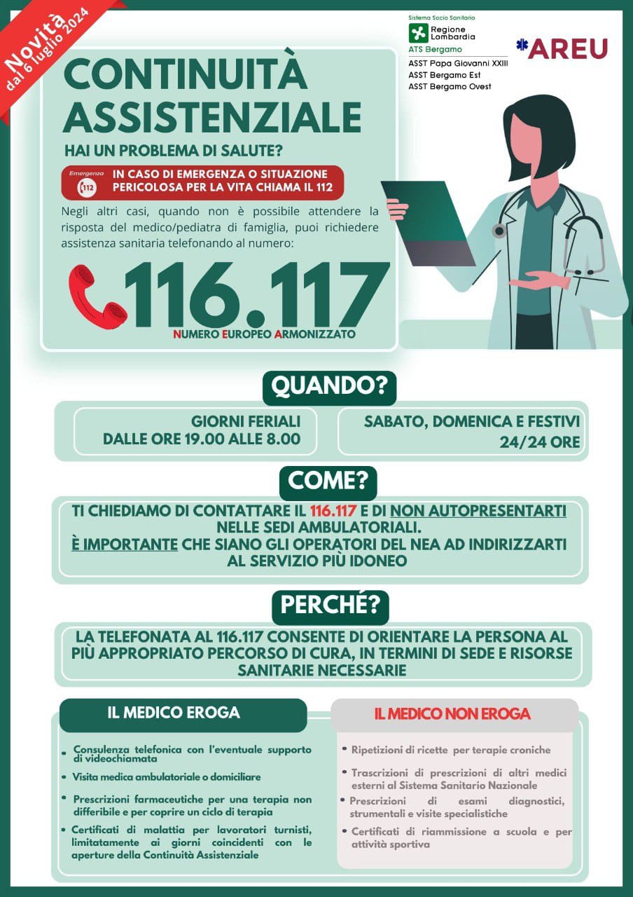 Dal prossimo 6 luglio, con l’avvio della Centrale unica di Bergamo, tutti i cittadini che avranno bisogno di assistenza sanitaria non urgente negli orari non coperti dal proprio medico, così come quelli rimasti senza dottore, potranno rivolgersi al nuovo servizio di Continuità assistenziale (ex guardia medica). A rendere nota questa possibilità è oggi (martedì 2 luglio) Ats Bergamo.