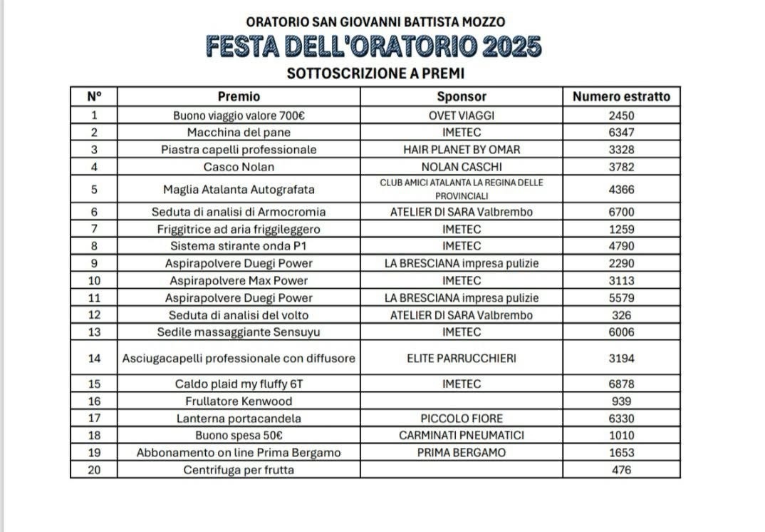 Mozzo/Oratorio: estrazione numeri vincenti admin16 giugno 2025blog post Navigazione articoli PrecedenteContinua Condividi:CondivisioneTweet Fai clic qui per stampare (Si apre in una nuova finestra) Stampa Fai clic per inviare un link a un amico via e-mail (Si apre in una nuova finestra) E-mail Mi piace Caricamento... Correlati